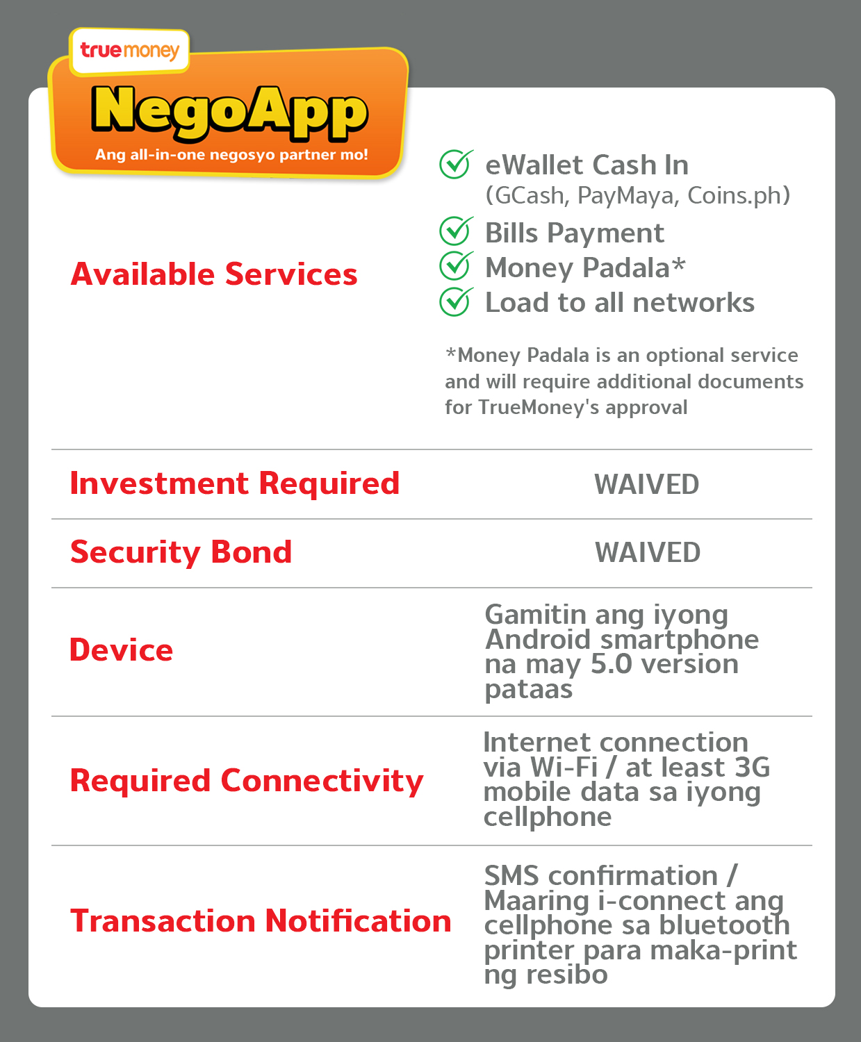 TrueMoney is a Non-Bank Financial Institution (NBFI) that aims to work with local business owners to serve communities in the Philippines that are not serviced by banking institutions or if serviced, have insufficient access to any banking services. TrueMoney Centers (referred to as ‘TMCENTERs’) are those authorized by TrueMoney to act as such TMCENTERs who will be providing the following payment services to customers: